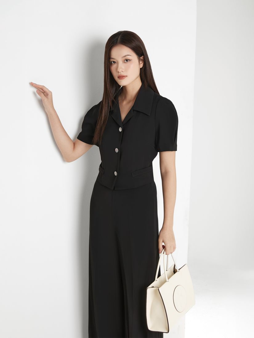 - Áo ký giả dáng ôm, tay ngắn với phần cổ tròn và chi tiết cúc đính máy kèm tag kim loại sang trọng. Có thể kết hợp cùng nhiều dáng quần âu hay chân váy.