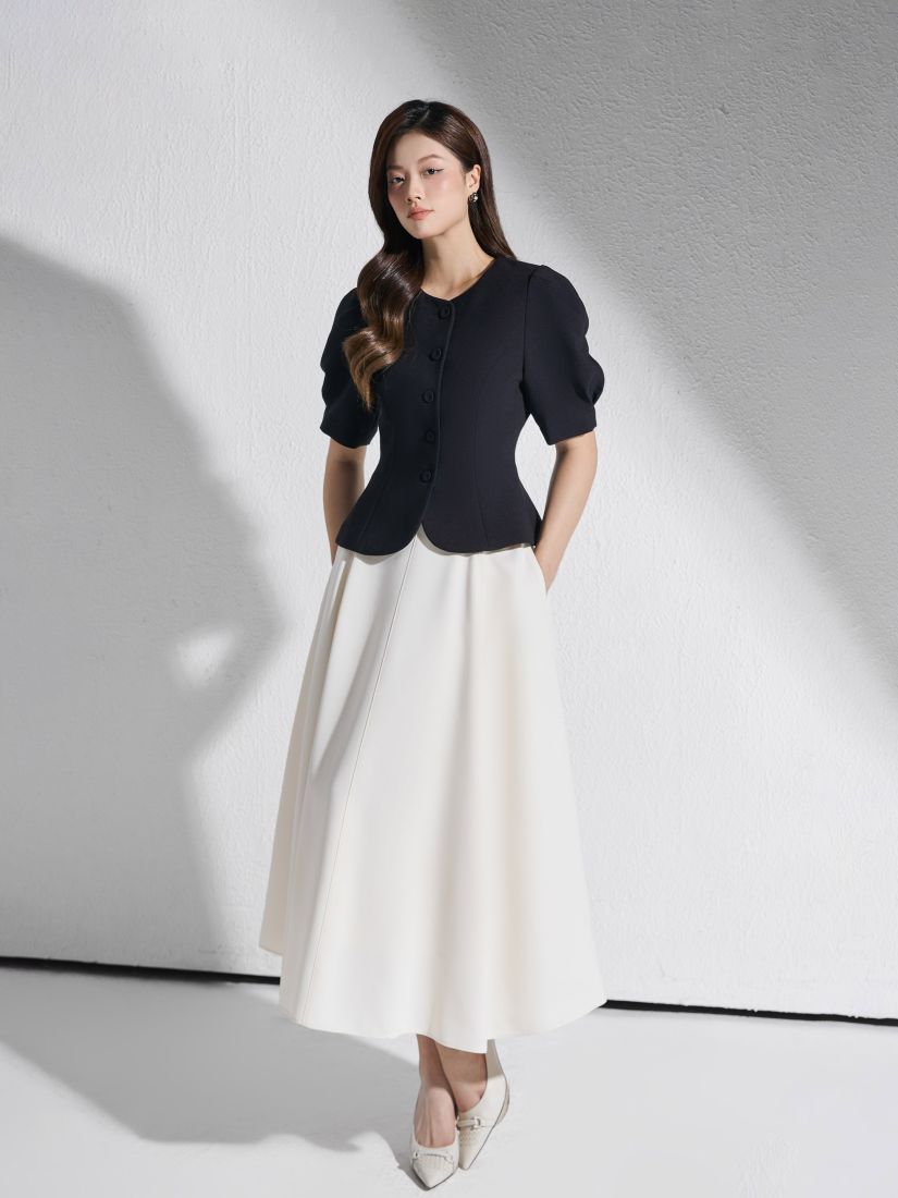 - Chân váy dáng xoè, cạp rời có khoá móc sau và chi tiết túi dọc. Có thể kết hợp với nhiều áo sơmi và vest khác nhau, phối cùng giày cao gót.